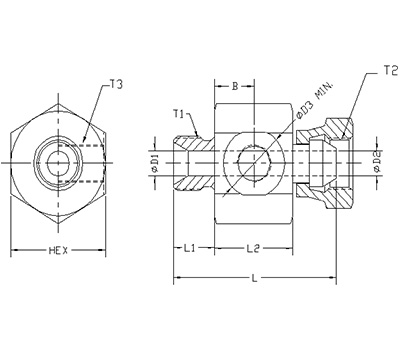 | ITEM | P/N | T1 | T2 | T3 | L | L1 | L2 | B | D1 | D2 | D3 MIN. | HEX |